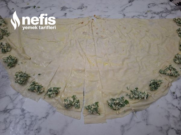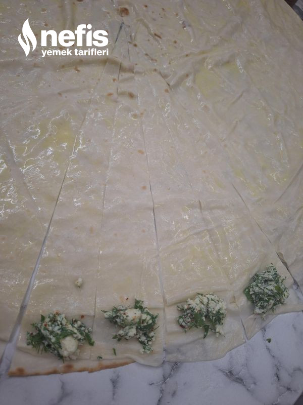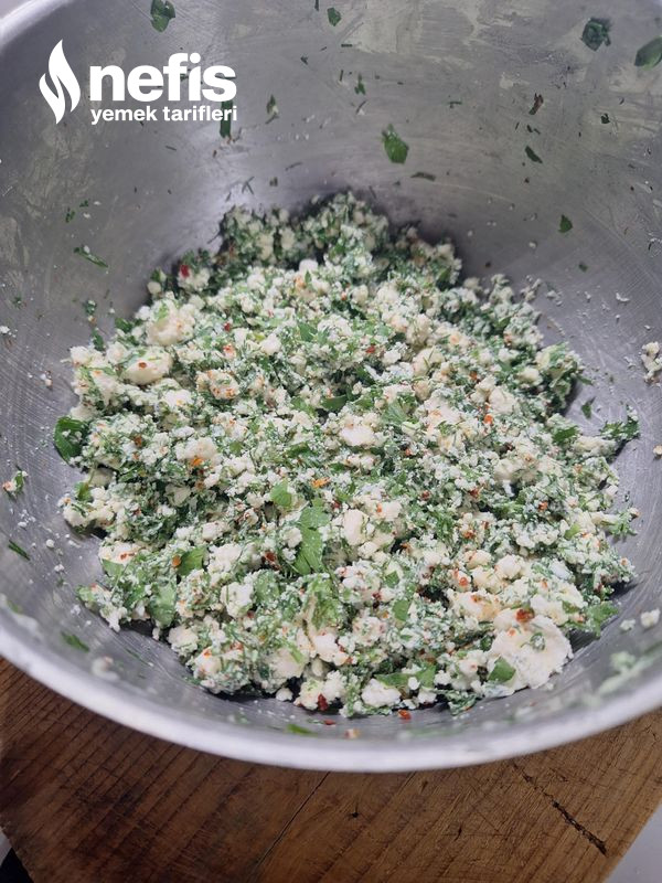 - Maydanozu dereotunu mümkün olduğunca ince ince kıyır kıyır doğrayın ,lor peynirini ben tam yağlı olduğu için yağ eklemesi yapmadım, tuz oranı her şey yeteri kadar hoştu eşit modüllerde yufkalara bölüştürdüm.