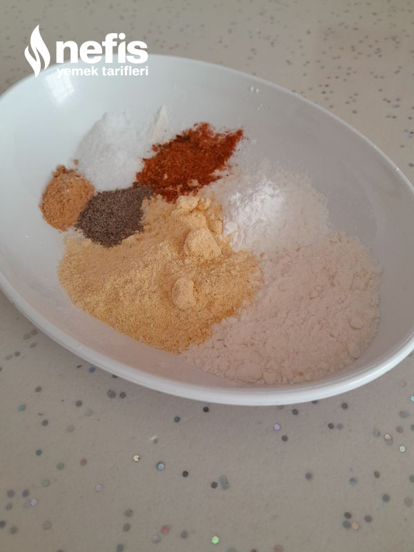 - Ardından bir kapta nişasta un mısır unu tuz ve baharatları karıştırın üzerine yarım sade soda dökün (biraz katı bir kıvam olursa çok daha çıtır olur).