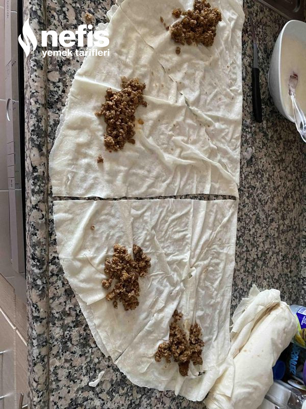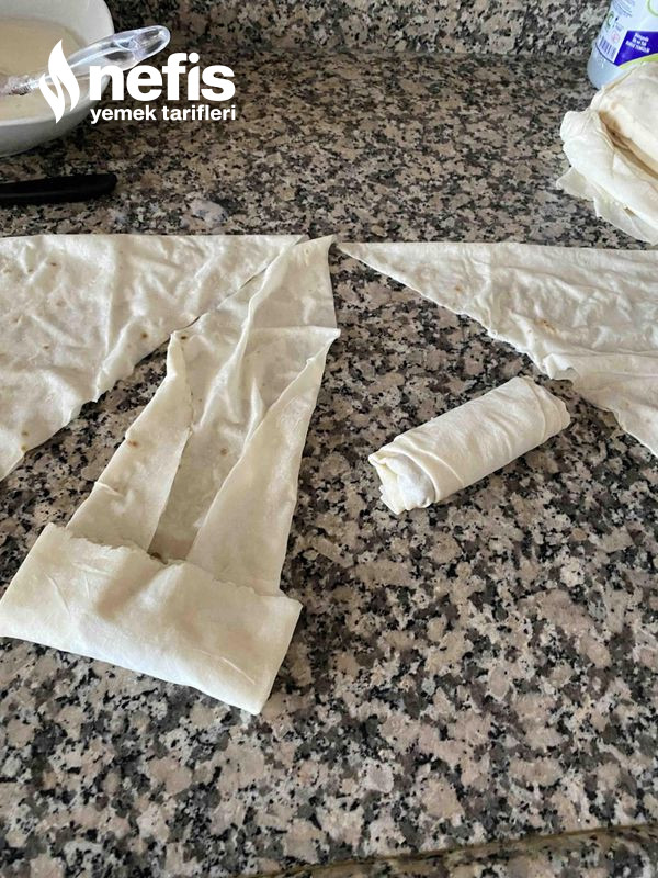 3. Her yufkayı ortalarına sos sürerek 2 ye katlayalım. Her yufkayı fotoğraftaki üzere üçgenlere bölelim. İster 5 ister 4 kesime. Geniş kısmına iç harçtan koyarak yanlardan kıvırıp rulo halinde saralım.