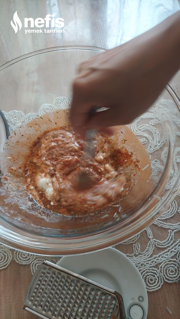 2. Yoğurt ,sıvı yağ ,süt, tuz, baharat ve bir diş sarımsağı rendeleyerek karıştıralım .