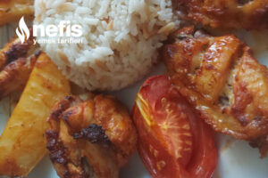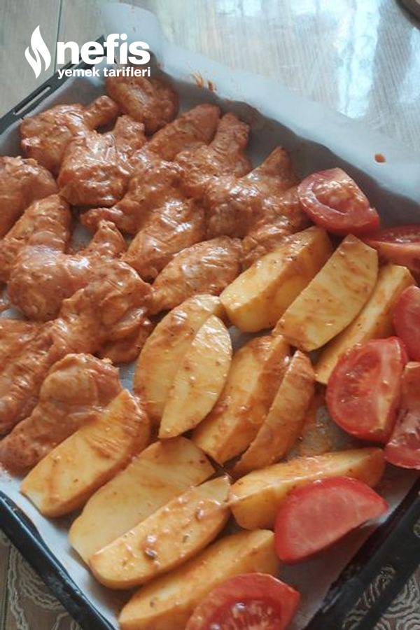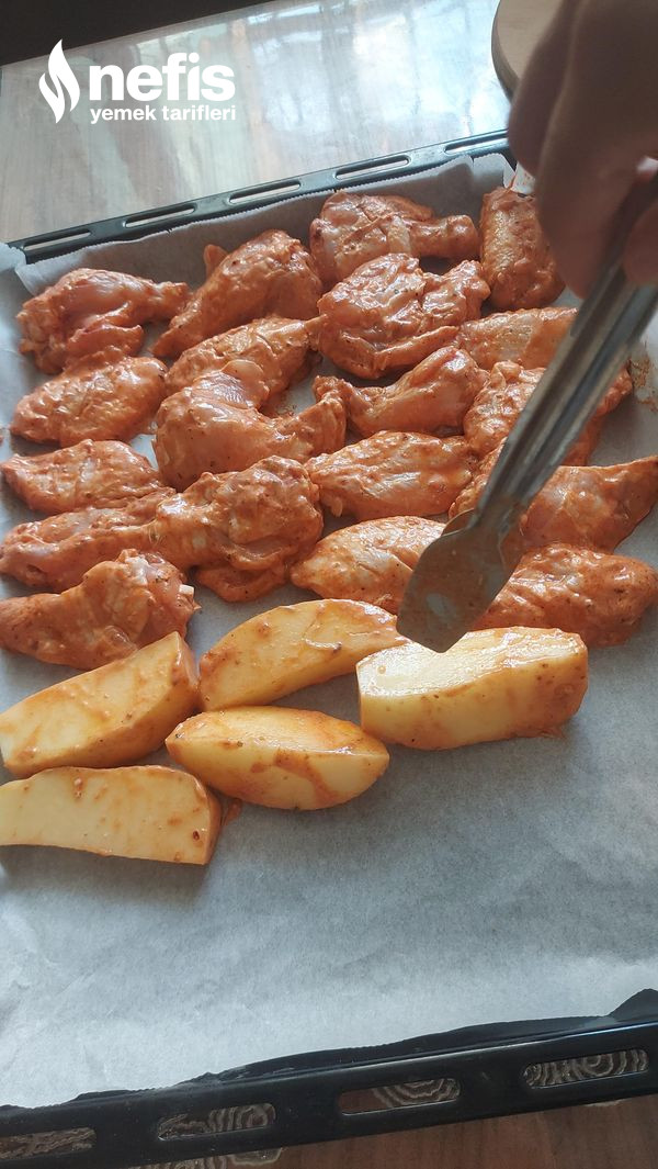 4. Dinlenen tavukları yağlı kağıt serili fırın tepsisine dizelim ,ben kalan sosun içerisine 2 adet iri doğranmış patates de ekledim çok yakışıyor .