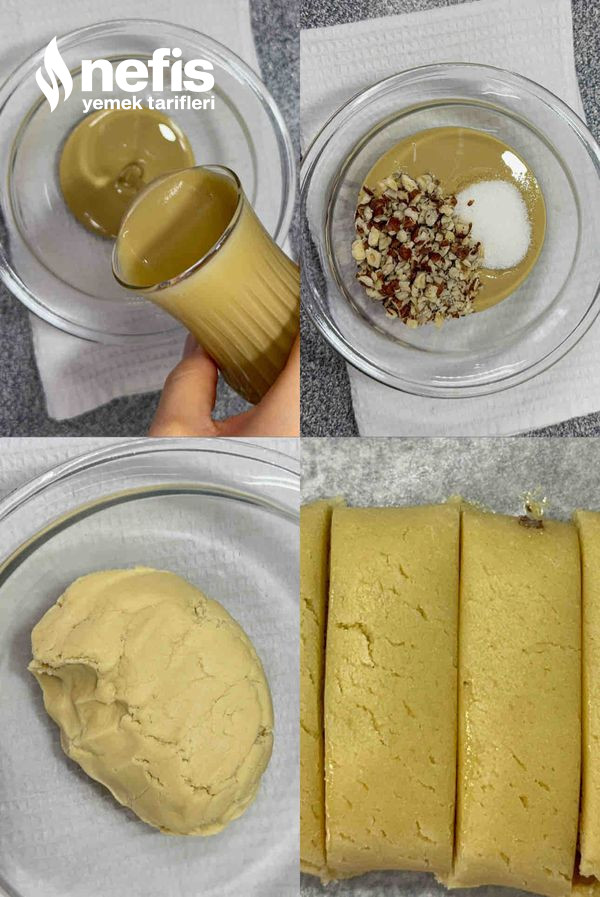 - İç dolgusu için tahin, toz şeker ve fındıkları karıştıralım.