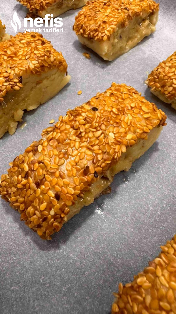 - Hamuru 1 parmak genişliğinde keselim evvel çırpılmış yumurta beyazına akabinde susama batırıp pişirme kağıdı serdiğimiz tepsimize dizelim.