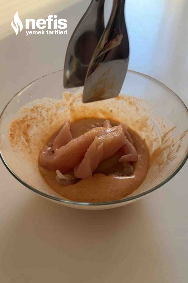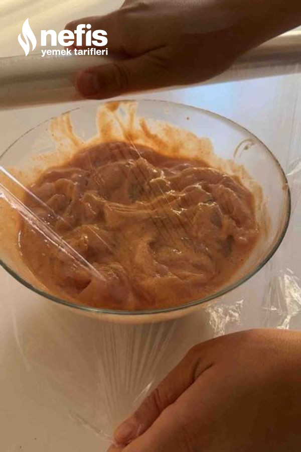 2. Daha sonra şeritler halinde doğradığımız tavuk göğsünü sosa ekleyelim ,iyice harmanladıktan sonra streçleyip 2 saat dolapta bekletelim.