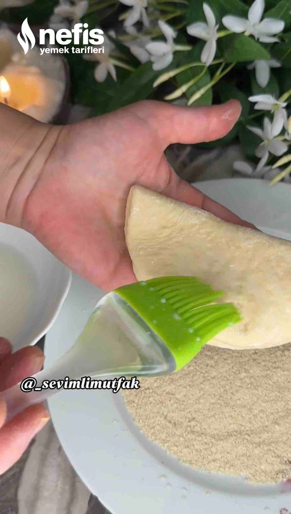 - Daha sonra her birini hafif unla 13 santim kadar açıyoruz ve ortasına yağ sürüp üzerine süt sürüyoruz ve galeta ununa buluyoruz.
