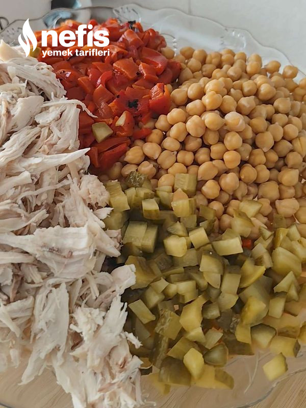 - Öncelikle nohutlarımızı haşlayalım. Tıpkı vakitte tavuk göğsümüzü biraz tuz ile uygun bir tencerede haşlamaya bırakalım. Bu ortada közlenmiş kapya biber ve kornişon salatalığı küp küp doğrayalım.