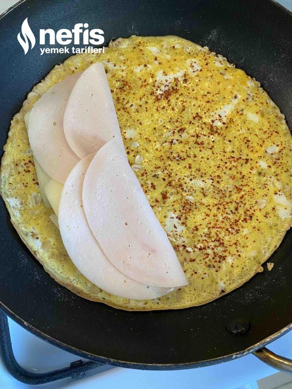 - Yumurtalar pişmeye başladığında yan tarafına kaşar peyniri ve jambonlu koyarak öteki tarafını üzerine kapatalım ( d hali verelim) 2-3 dk daha pişirelim.
