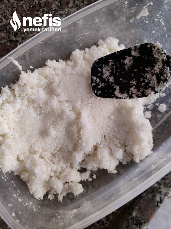 - Ardından karıştırma kabına alıyoruz, şeker ve hindistan cevizini alıp karıştırıyoruz. Ve 10 tane hindistan topu yapıyoruz.