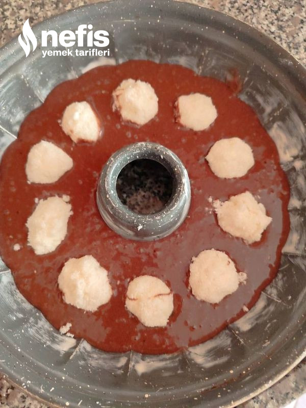 - Yağladığımız kalıba kek hamurunun yarısını koyup yuvarlağımız hindistan toplarını diziyoruz.