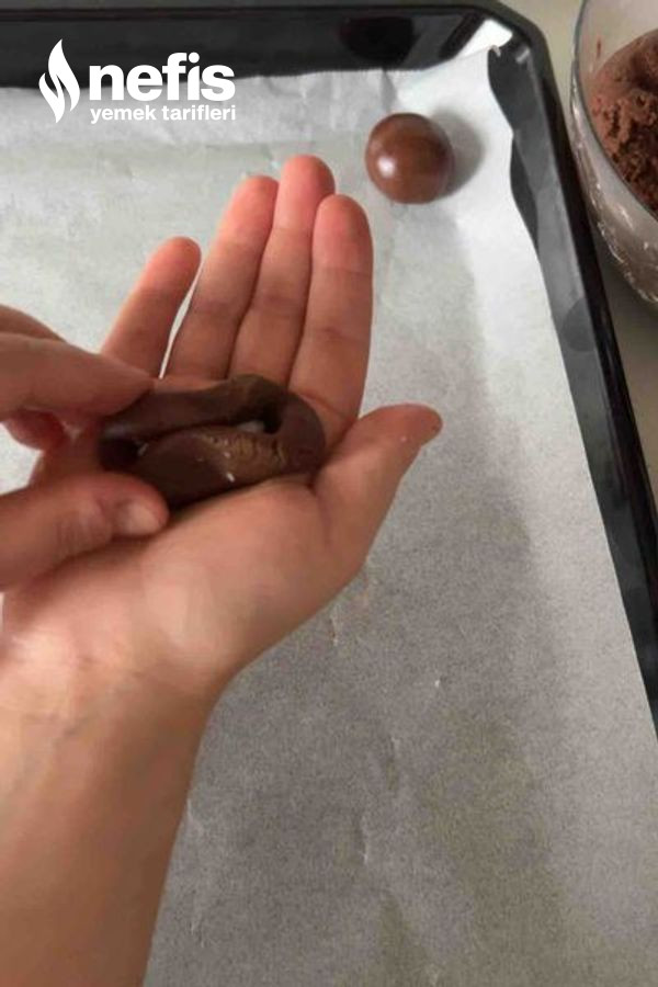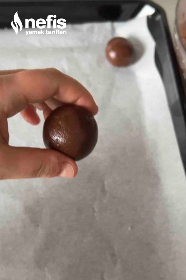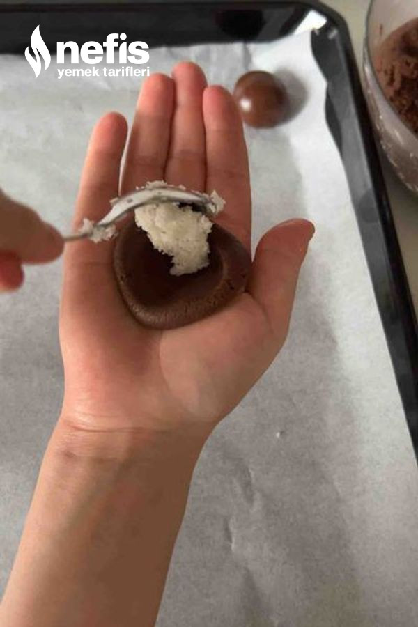 - Ceviz büyüklüğünde kesimler koparıp içine hindistan cevizi ile karıştırılmış ,yumurta akından yaklaşık 1 çay kaşığı dolusu ekleyip tekrar kapatıp yuvarlıyoruz.