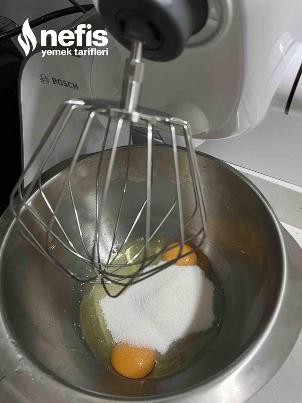 1. İlk olarak kelepçeli kalıbımızın altını pişirme kağıdı ile kaplayalım, çırpma kabına yumurta ve şekeri alıp beyazlaşana kadar çırpalım.