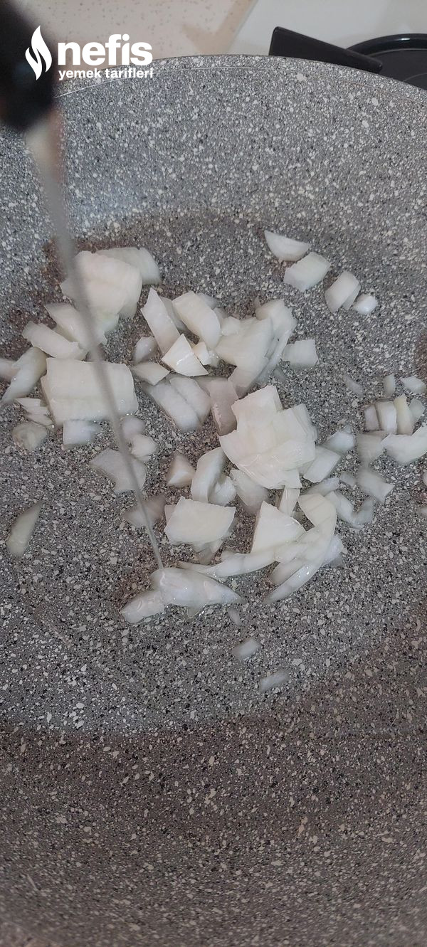 - Öncelikle kuru soğanımızı küp küp doğrayıp tavada kızartıyoruz.