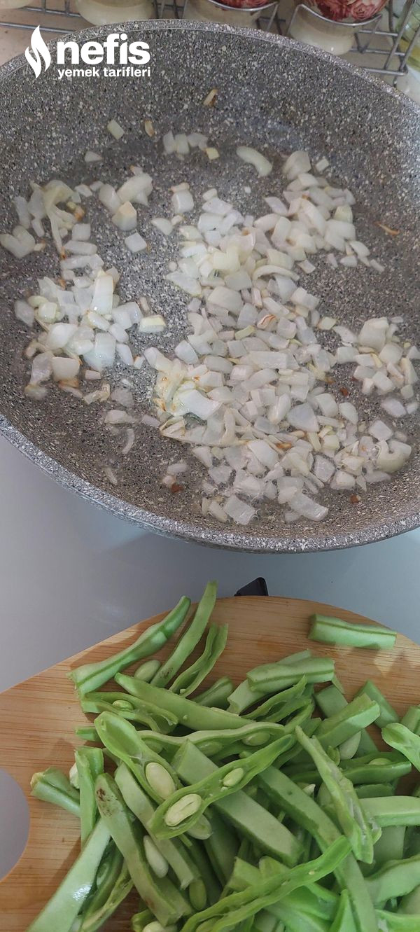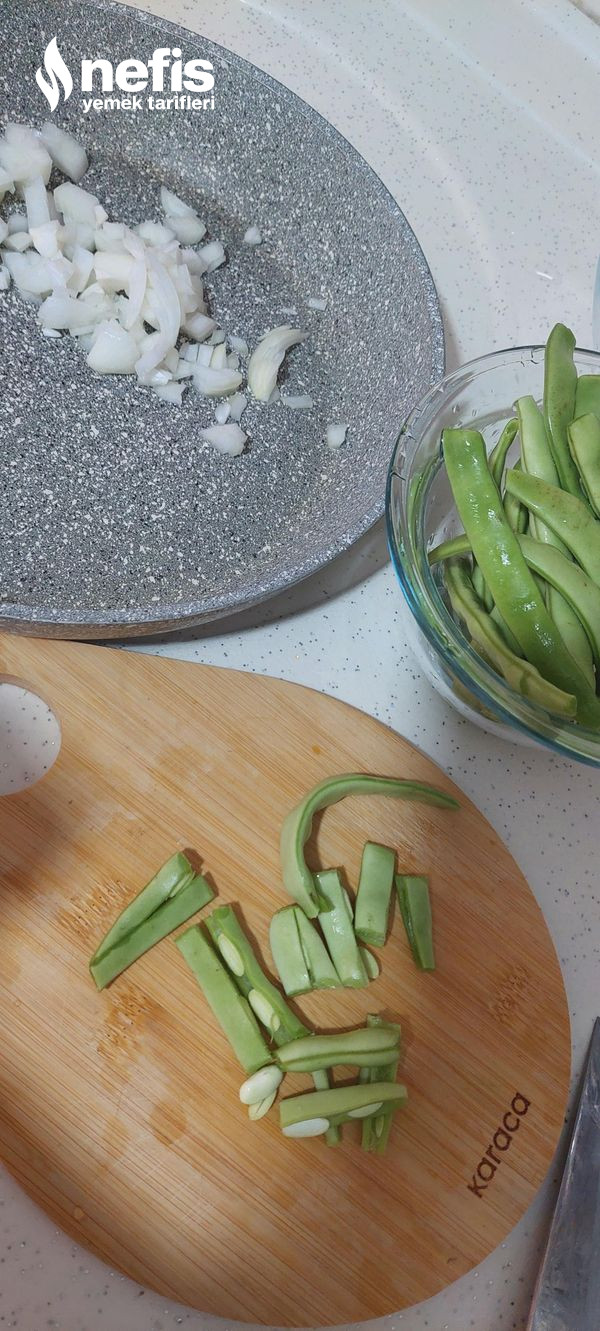 - Fasulyelerimizi uçlarını alıp ortadan bölüp iki ayırdıktan sonra küçük küçük doğruyoruz ,doğradıktan sonra kavurduğumuz soğanların üzerine fasulyelerimizi atıyoruz.
