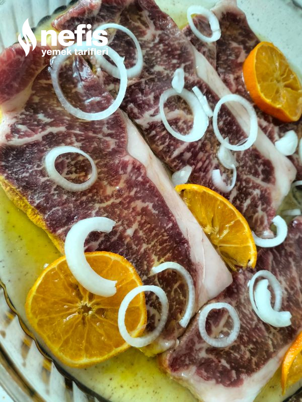 - İlk evvel etleri, yarım ay halinde doğranmış yarım soğan, dilimlenmiş portakal ile bir arada yağlarda dinlendirelim. İçine sarımsak ta atabilirsiniz dilimleyip. En az 4-5 saat tercihen 1 gece buzdolabında dinlensin.