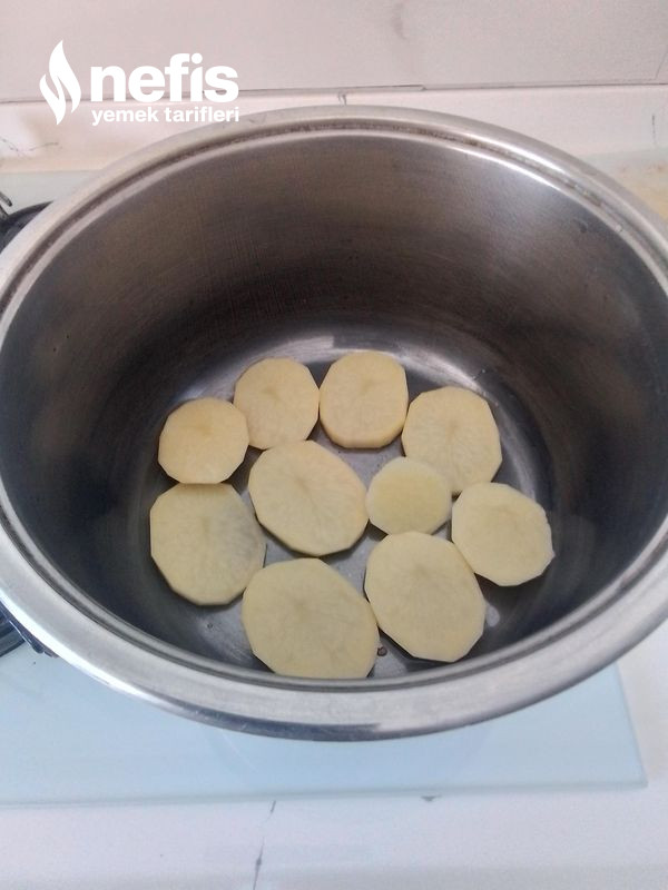 - Daha sonra kestiğimiz patatesleri yapacağımız tencerenin tabanına 1 yemek kaşığı sıvı yağ ekleyip fotoğrafta ki üzere dizelim.