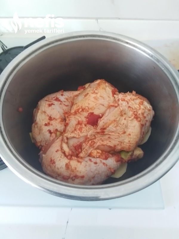 - Hazırladığımız harcı tavuklar ile karıştırıp daha sonra tavukları patateslerin üzerine koyalım.