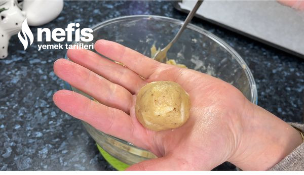 5. Hamurdan ceviz büyüklüğünde modüller koparılır ve yağlı kâğıt serilmiş tepsiye alınır.