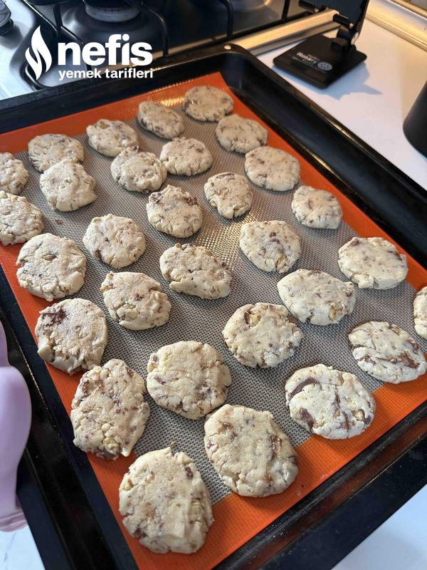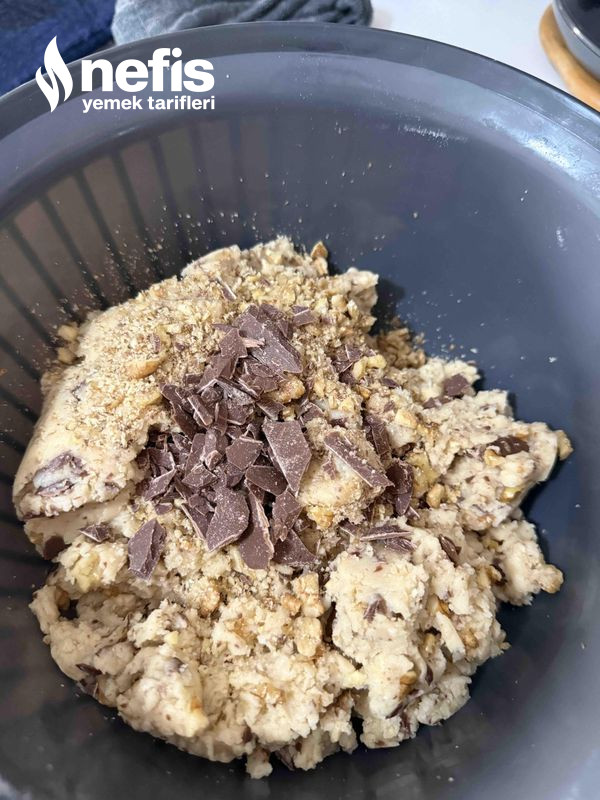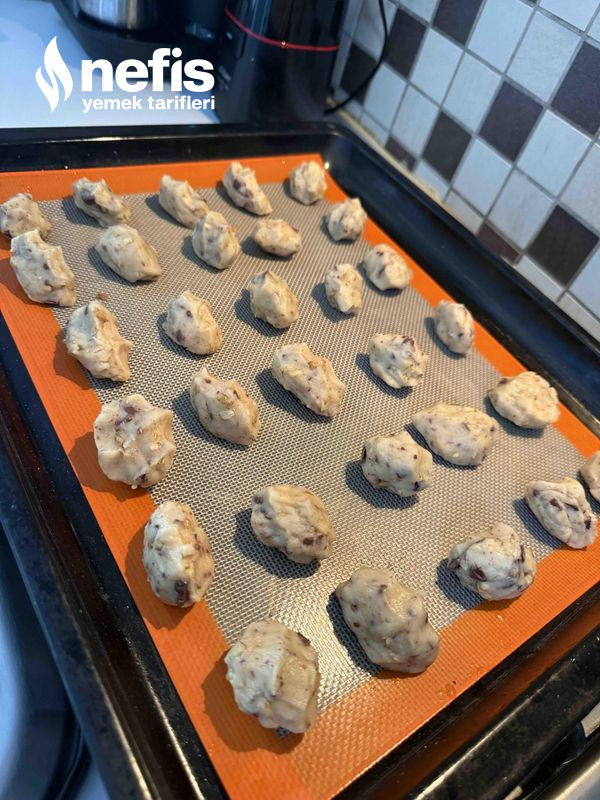 3. Daha sonrasında ceviz ve çikolatayı da ekleyip yuvarlayıp tepsilere koyalım.