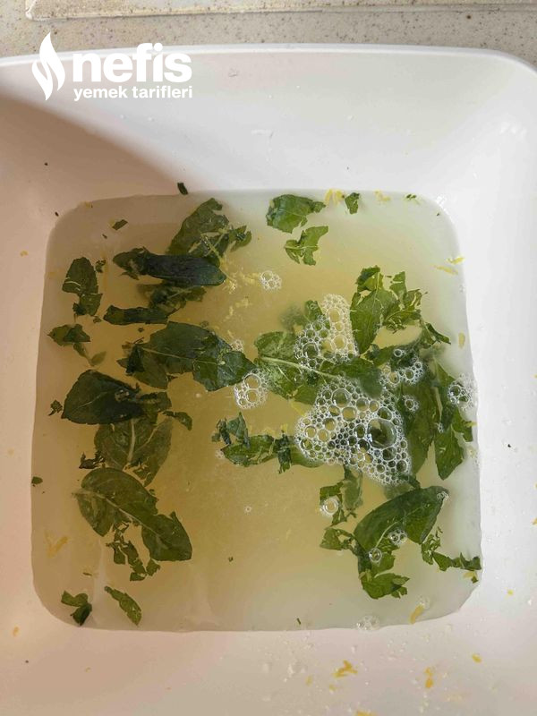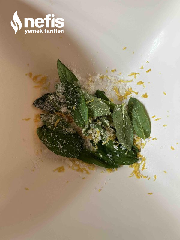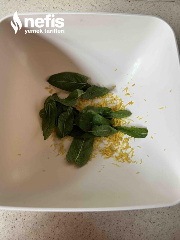 - Rendelediğiniz limon kabuklarının üzerine nane yapraklarını ve toz şekeri ekleyin.