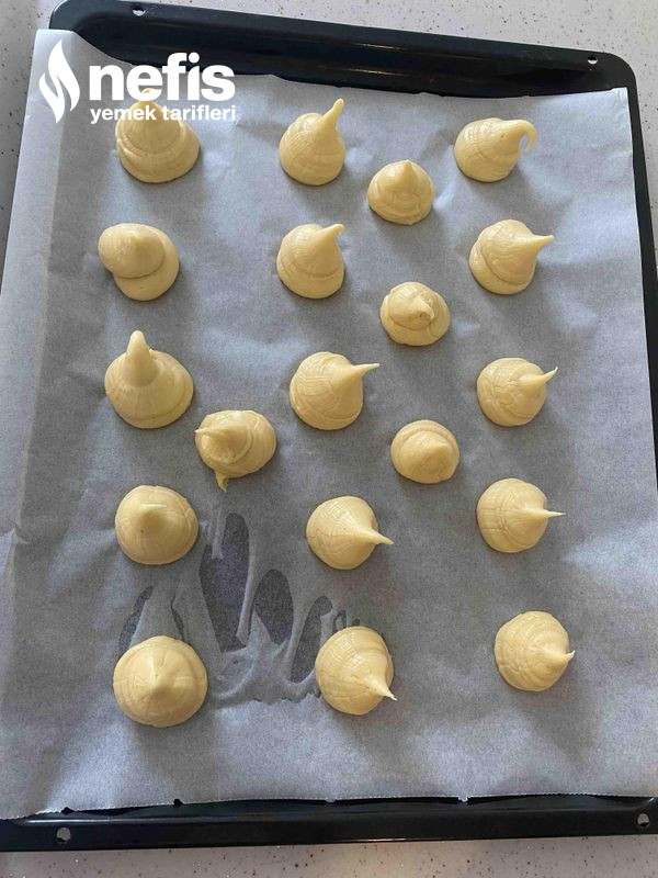 9. Hamuru sıkma torbasına alıp torbanın ucunu kesip yağılı kağıt serili tepsiye 3 parmak aralıklarla sıkın kıtır hamuru dondurucudan çıkarıp bardakla kesin ve choux hamurlarının üzerine yerleştirin.