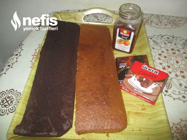 - Kekleri düz bir tepsiye alalım, üç cm eninde şeritler keselim, servis tabağına bir sade bir kakaolu olarak koyalım, üzerine tatlı kaşığı yardımıyla kayısı reçeli sürelim yapıştıralım, beyazin üzerine kakaolu, kakaolunun üzerine sade dizerek yapalım.