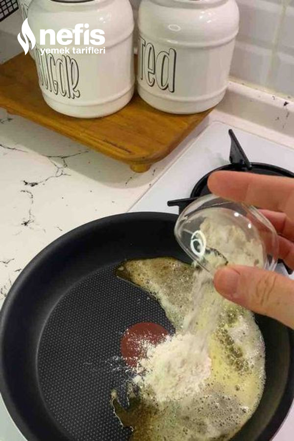 - Öncelikle tavaya tereyağını alalım, tereyağı eriyince bir yemek kaşığı unu ek edelim, hafif kavuralım.