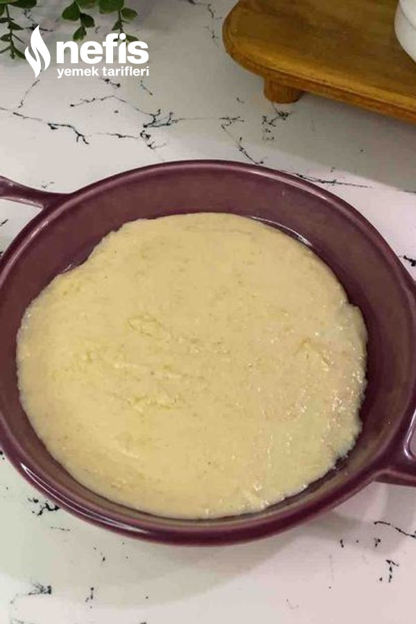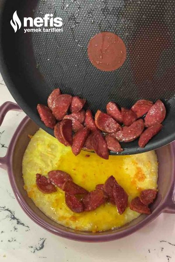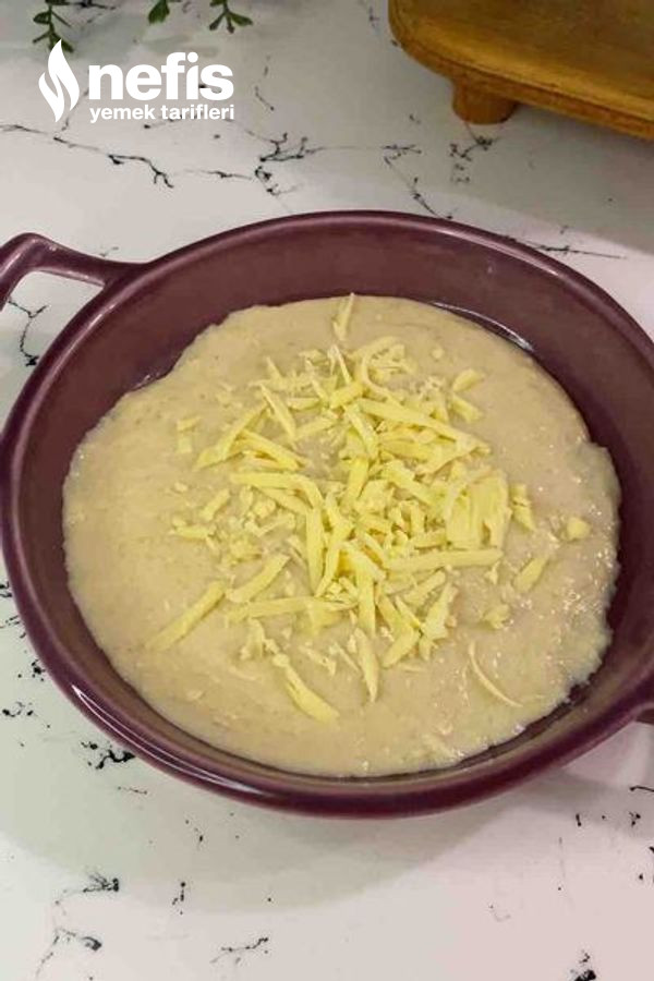 - Kıvam aldıktan sonra fırın kabına dökelim üzerine kaşar peyniri rendesi serpelim.