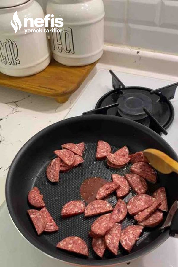 - Fırından çıktıktan sonra biraz sıvı yağ da yarım ay formunda doğradığımız sucukları soteleyelim.