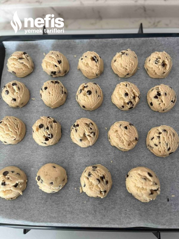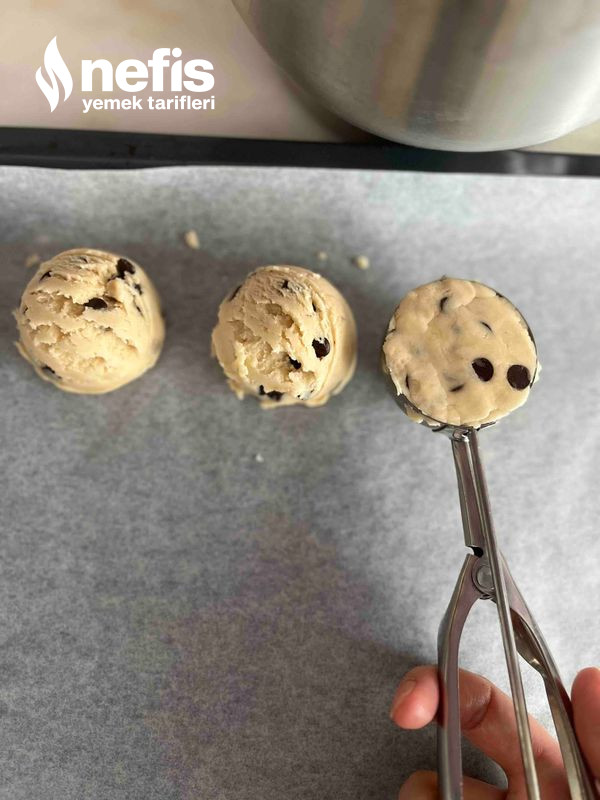 - Dondurma kaşığına hamuru koyup yavaşça bastırın ve kaşığı aykırı çevirip yağlı kağıt serili fırın tepsisine çıkartın.