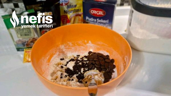 1. Un ve damla çikolata ve kuş üzümü hariç başka materyalleri karıştıralım.