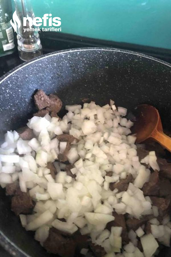 - Suyunu çekince 3-4 yemek kaşığı sıvı yağ ve yemeklik doğradığımız soğanları ek edip karıştırmaya devam edelim.