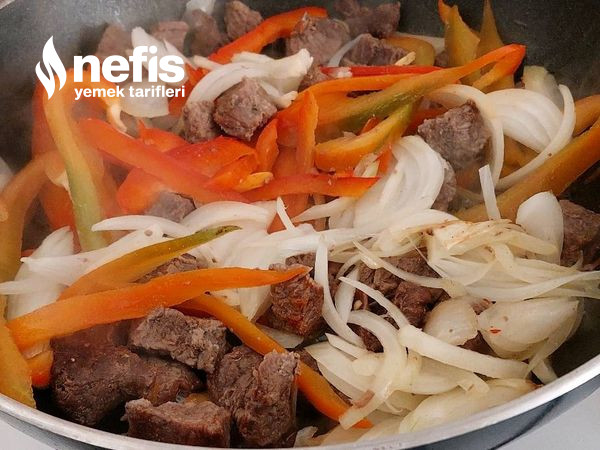 - Öncelikle uygun bir tavaya yağı alalım kızgın yağın üzerine kuşbaşı kıyılmış olan etleri ek edelim.