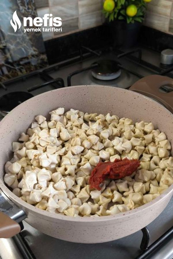 - Sıvıyağda mantıyı biraz kavurun, salçayı ekleyin ve biraz daha kavurun.