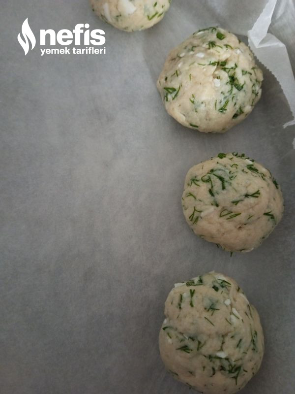 2. Unu yavaş yavaş ekleyerek yumuşak bir kıvam elde edelim peynir dereotu ve kabartma tozunu ekleyip güzelce karıştıralım. Sonrasında küçük bezeler halinde yuvarlayıp, tepsiye dizelim.
