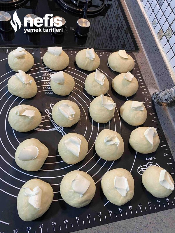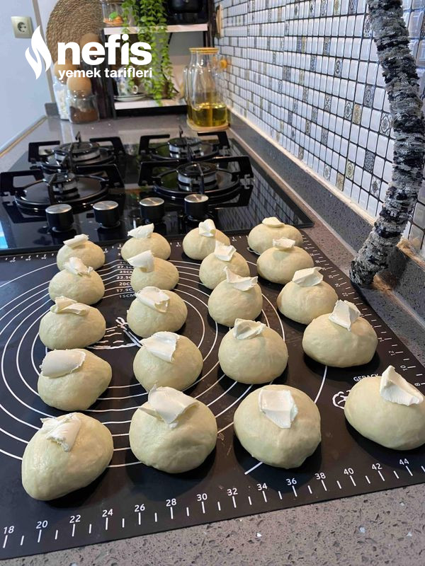 - Açma için tıpkı yumurta büyüklüğünde bezelere ayırın ve ortalarına birer çay kaşığı tereyağ ekleyip açalım ortalarına peynir ekleyip sarıp form verip tepsiye dizelim.