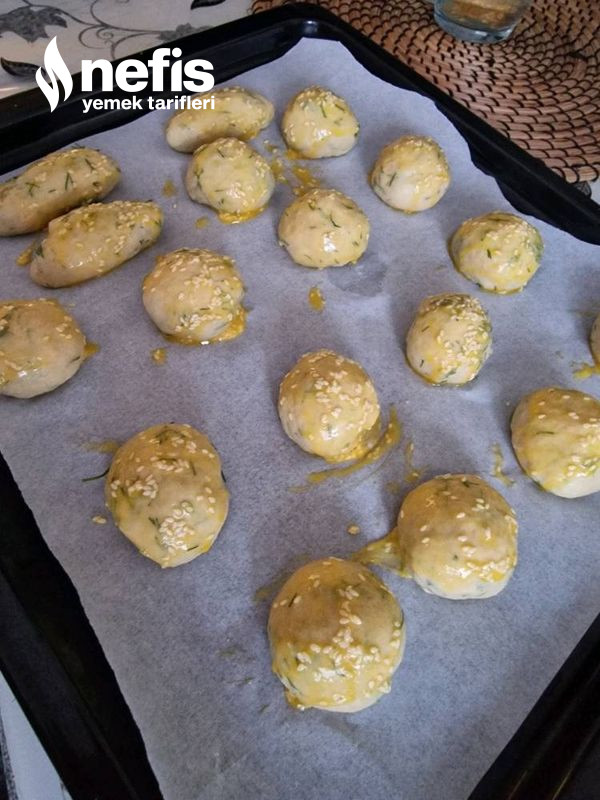 2. Yıkayıp doğradığınız dereotunu ekleyip güzelce yoğurun karışsın küçük küçük bezeler alıp kasar ekleyip, yuvarlayın tepsiye dizin. Üzerlerine susam ve yumurta sarısını sürün.