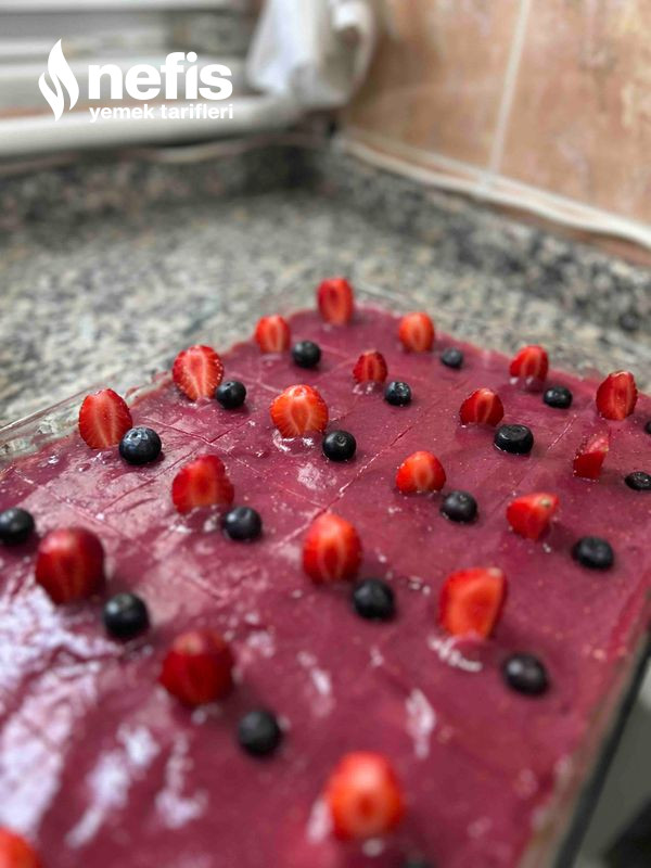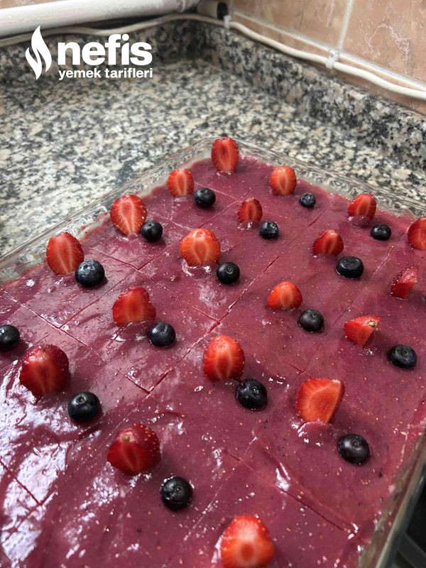 6. Jeli için çilekleri ve yaban mersinini yıkayıp sos tavasına alalım biraz su ile birlikte pişirelim ve blendır ile bir kaç bız bız yapalım güzelce çekince şekerini ve nişastasını da ekleyerek pişirelim (sürekli karıştıralım ki tabanına tutmasın )