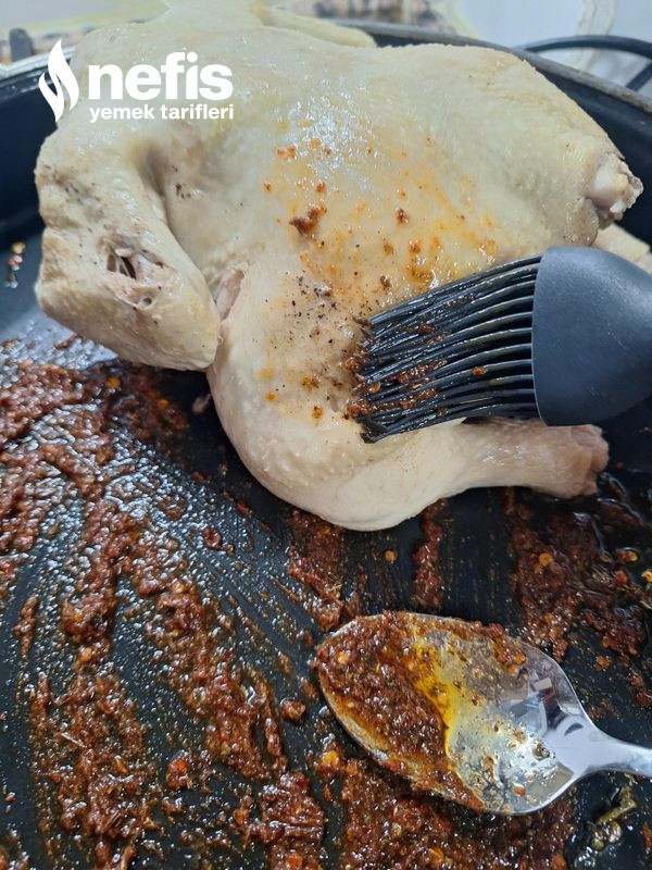 - Bir yandan fırın kabının içine tüm materyalleri karıştırın haşlanmış bütün tavuğu süzüp, sosu güzelce bulayın.