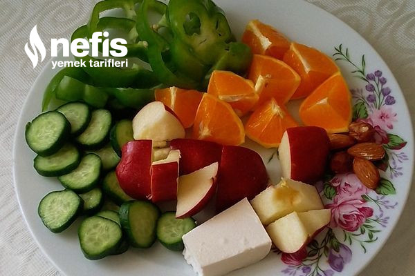 Portakalı, salatalığı, elmayı ve biberi orta büyüklükte doğrayarak tabağa yerleştirelim. Akabinde fındık ve bademi servisin yanına ekleyerek tamamlayalım. Afiyet olsun ♨️🍴.