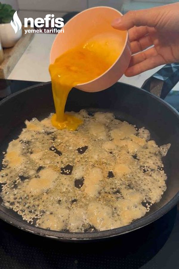 - Yumurtaları kırıp çırpın ve peynirin üzerine dökün.