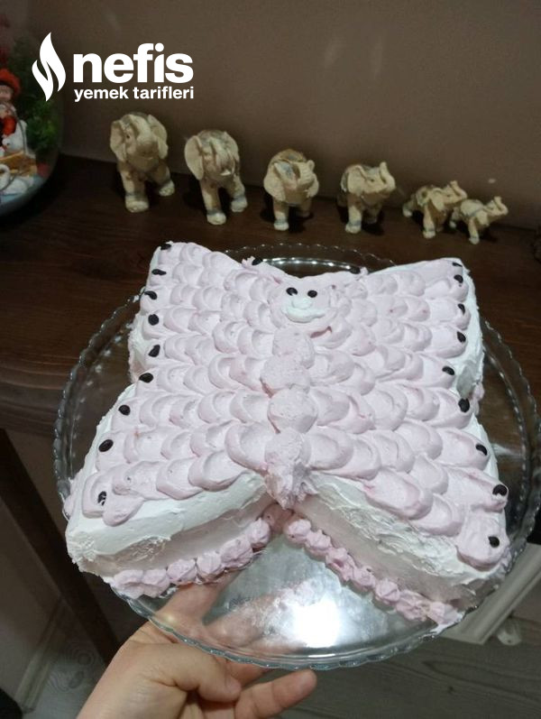 Not: Ben pastayı evvel ortadan ikiye böldüm, daha sonra her parçayı da ortadan yarım daire olcak formda kestim ve kenar kısmını kesip aldım. Akabinde üstünü kremayla sıvazlayıp süsledim.