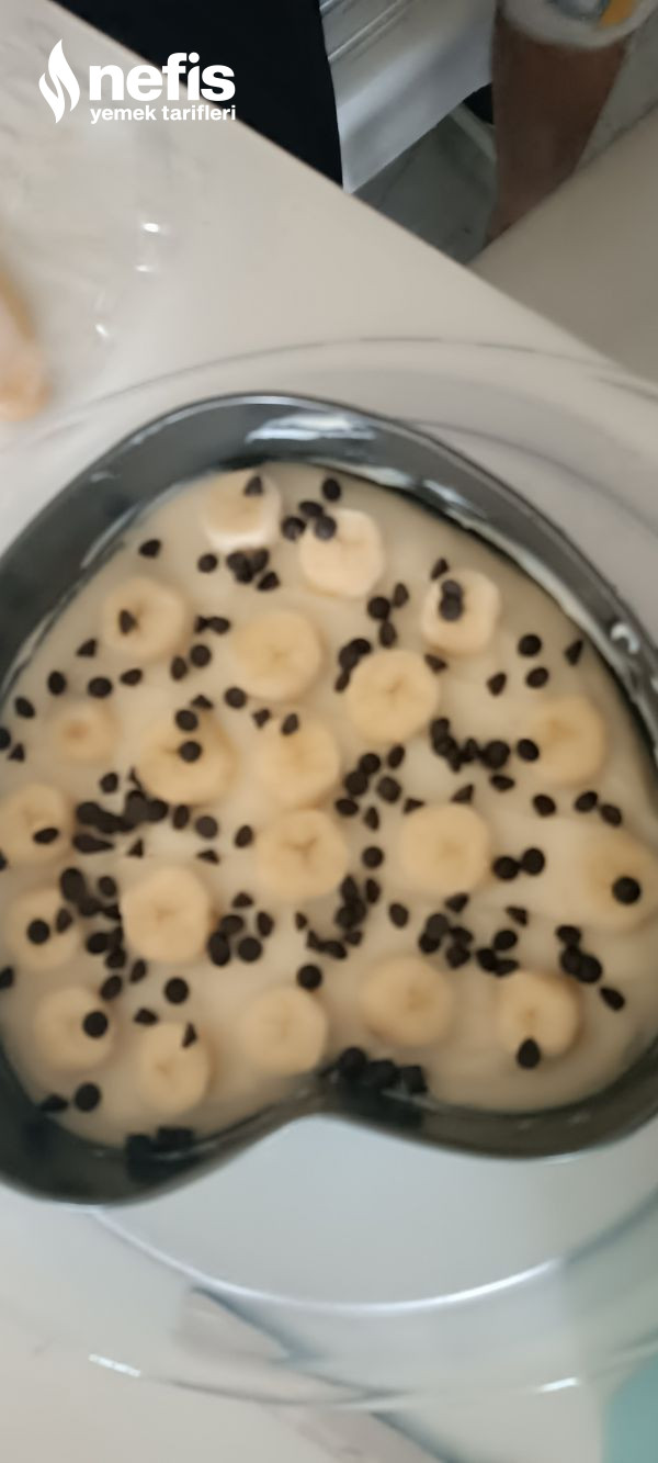 - Üzerine muhallebi ekleyip muz ve damla çikolata serpelim tekrar 2. sıra kedi lisanını sütle ıslatıp dizelim.
