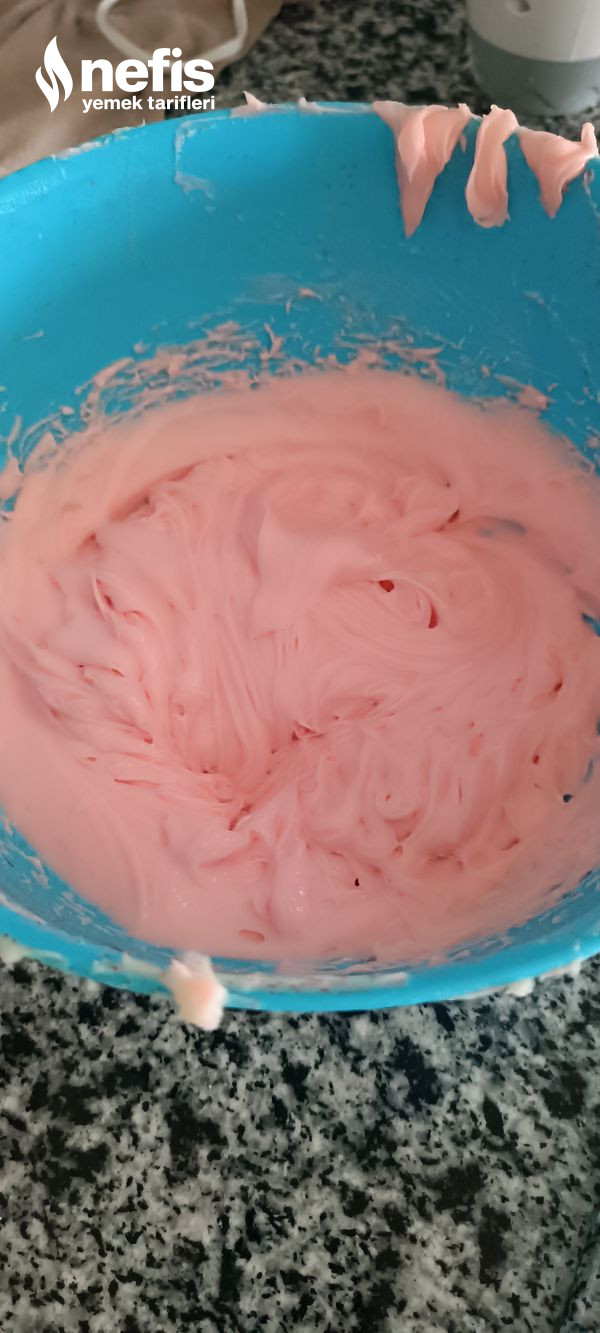 - Geriye kalan muhallebinin içine yarım çay bardağı süt, 1 paket kremşanti ve besin boyasını ekleyip çırpalım pastanın üzerini süsleyelim 1 gece buzdolabında bekletelim afiyet olsun.