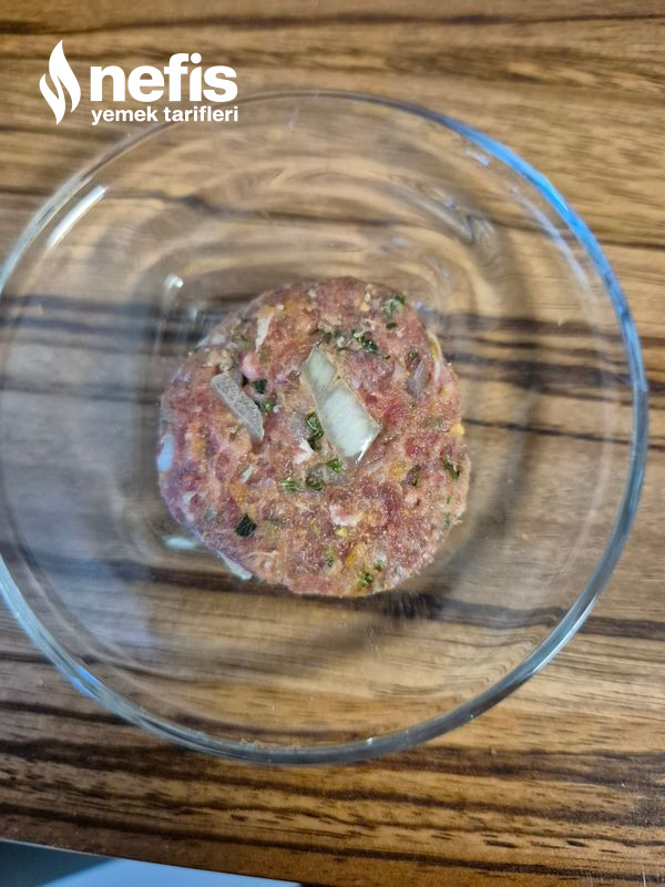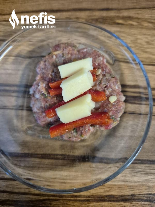 - 1 beze kıyma hamuru alınır, eli ile bastırılır, düz halini aldıktan sonra içersine kaşar ve biber konur.