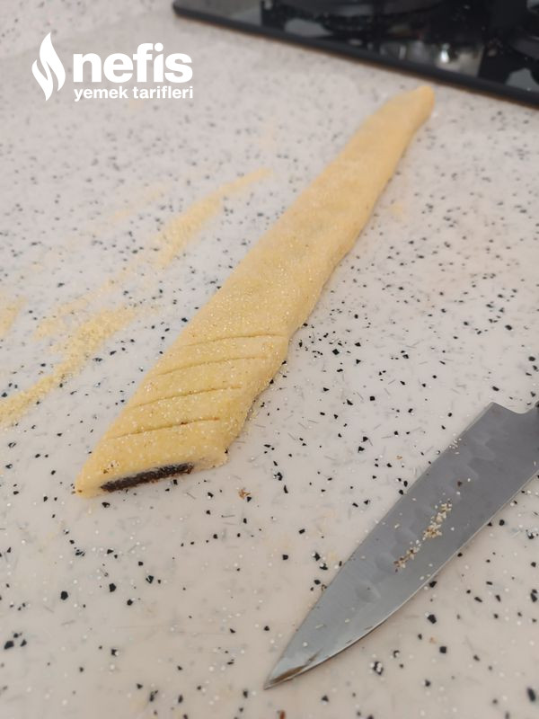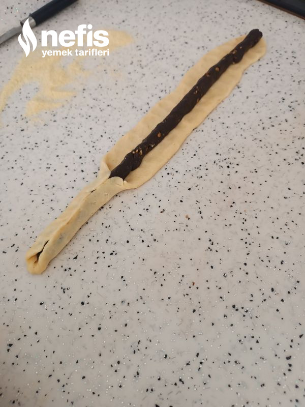 - Sade hamuru tezgah üzerinde uzunlamasına açıp, ortasına kakaolu malzemeyi koyup, kapatın irmiğe bulayıp dilediğiniz biçimde kesin.