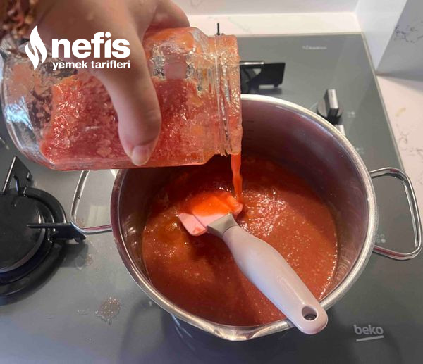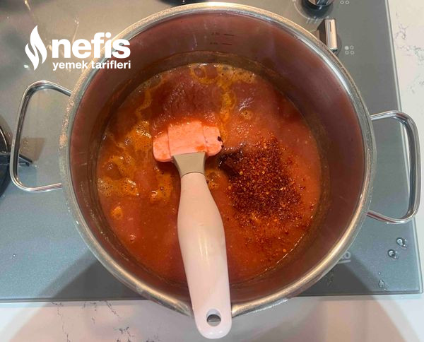 - Krema üzere bir doku oluştuğu vakit üzerine domates sosumuzu, domates salçası, biber salçası, isteğe bağlı olarak acı pul yahut toz biber ek ediyoruz.