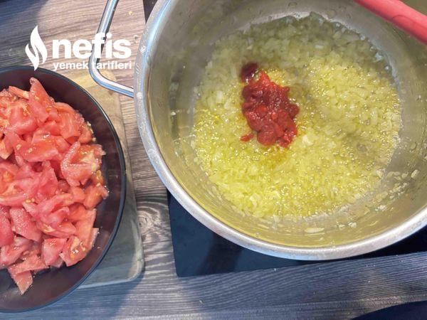 2. Ezilmiş sarımsakları, domates salçasını, isteye nazaran soyulmuş yada soyulmamış domatesleri (sonuçta blender’dan geçireceğiz, fakat ben soydum) ekleyip kavuruyoruz.