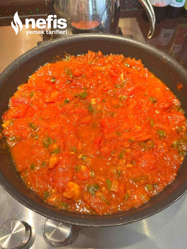 3. 1 tatlı kaşığı şeker ve tuzu eklenerek kapağı açık formda tavada pişirmeye devam edilir. Suyunu salıp domatesler eriyince (yaklaşık 25-30 dakika sonra) altı kapatılır.