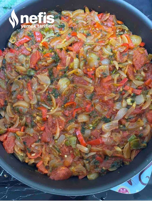 - Soğanlar piyazlık doğranır sarımsaklarla biberlerle güzelce kavrulur, üzerine domates, salça, maydanoz ek edilir güzelce kavrulur.
