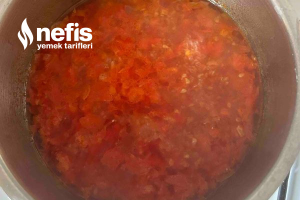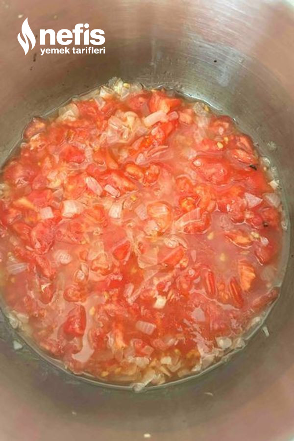 - Kavrulan soğanın içine kabukları soyulmuş ve ufak doğranmış domatesler atılır ve pişmeye bırakılır.